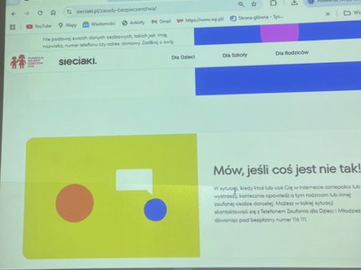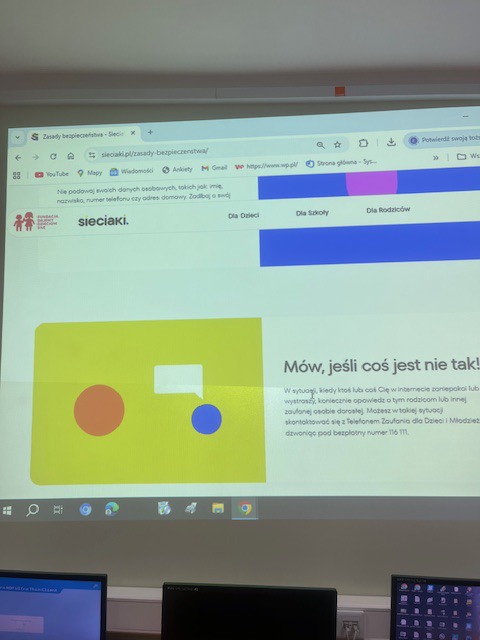 W ramach lekcji informatyki w klasach 5 i 6 uczniowie uczestniczyli w zajęciach poświęconych bezpiecznemu korzystaniu z Internetu. Kluczowym narzędziem dydaktycznym był portal edukacyjny Sieciaki.pl. Uczniowie zapoznali się z zasadami bezpiecznego korzystania z Internetu.