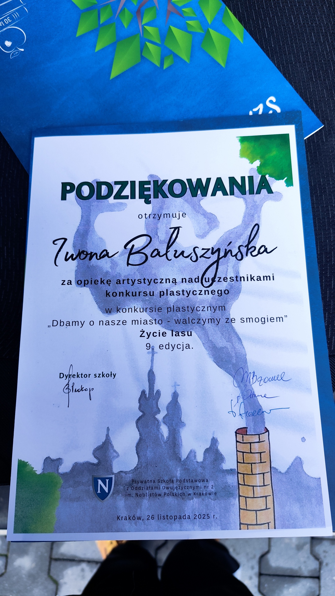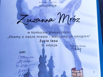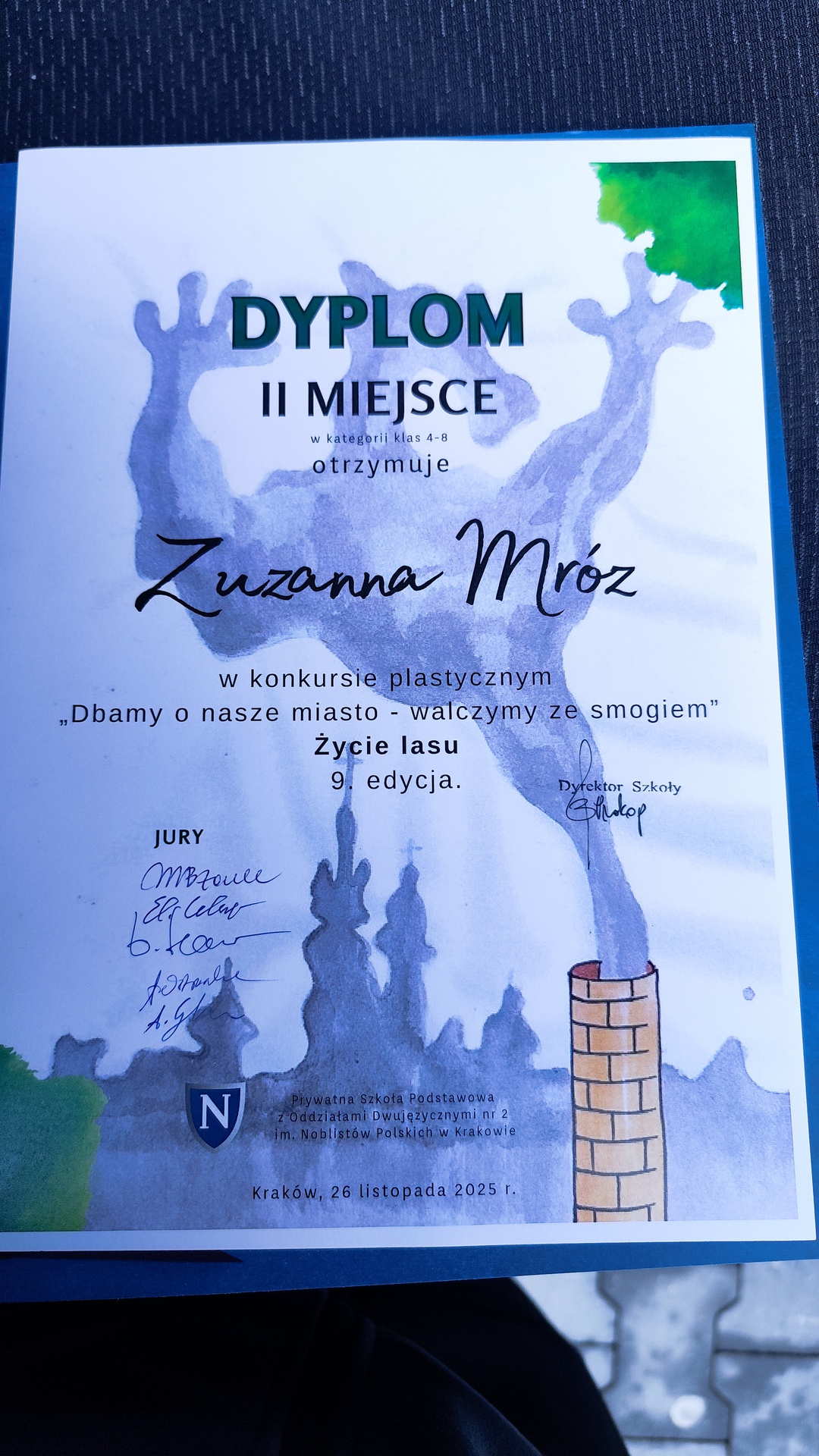 Z radością informujemy, że Zuzanna Mróz, uczennica klasy 4, zdobyła II miejsce w 9. edycji małopolskiego konkursu „Dbamy o nasze miasto – walczymy ze smogiem”, którego tegorocznym tematem było „Życie lasu”. Konkurs organizowany jest przez Prywatna Szkoła Podstawowa z Oddziałami Dwujęzycznymi nr 2 im. Noblistów Polskich w Krakowie. Inicjatywa cieszy się wsparciem wielu instytucji — m.in. patronat honorowy objęli prezydent miasta, fundusze ochrony środowiska, przedstawiciele lasów państwowych, a także lokalne instytucje kulturalne. Zuzia przygotowała piękną pracę plastyczną przedstawiającą bogactwo życia leśnego, wykazując się dużą wrażliwością artystyczną i zrozumieniem roli lasów w przyrodzie. Jej zaangażowanie i kreatywność zostały docenione przez jury konkursowe. Serdecznie gratulujemy Zuzi sukcesu oraz życzymy jej dalszych osiągnięć artystycznych! |