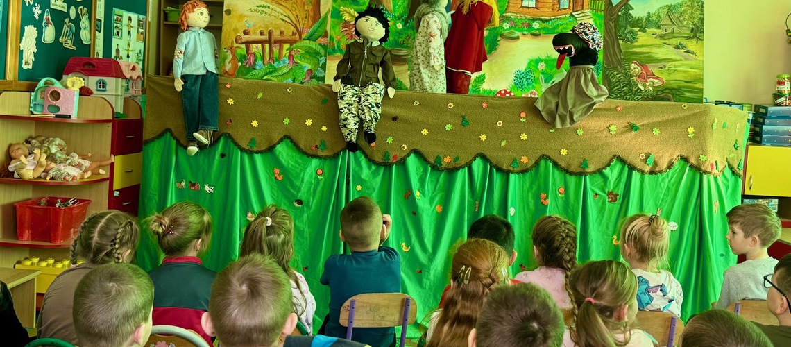 | Oddział przedszkolny odwiedził teatr lalek, który zaprezentował dzieciom przedstawienie pt. „Czerwony Kapturek”. Spektakl został przedstawiony w ciekawy i humorystyczny sposób, dzięki czemu dzieci z dużym zainteresowaniem śledziły losy bohaterów bajki.