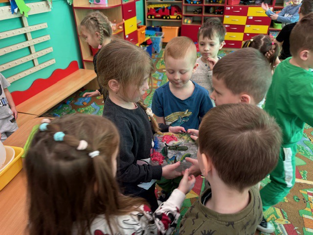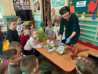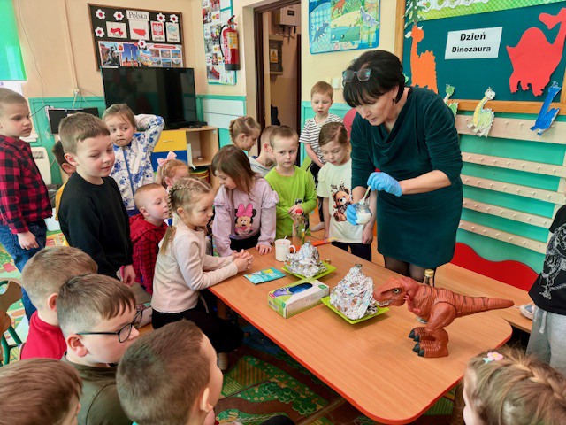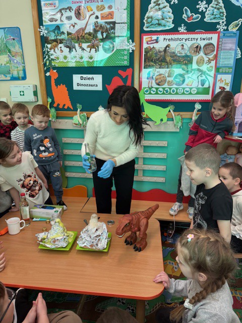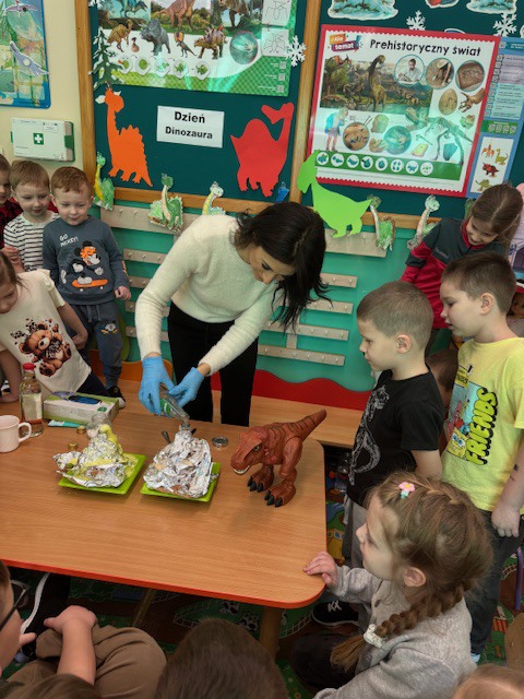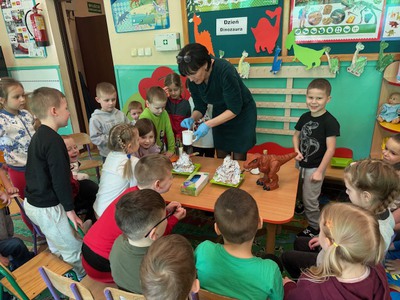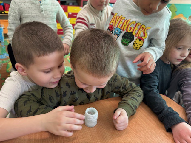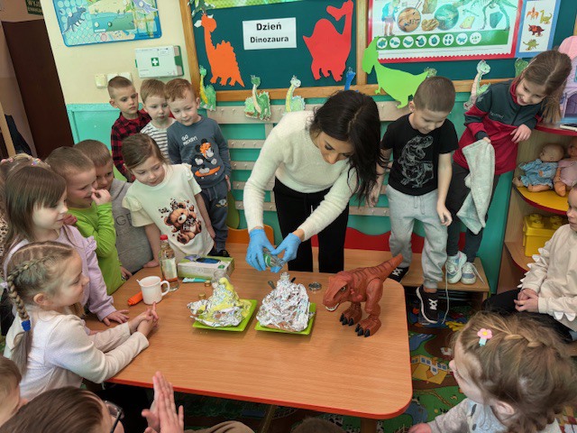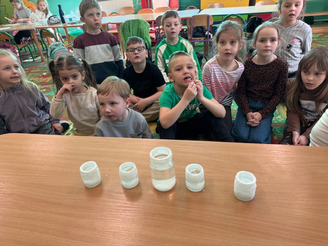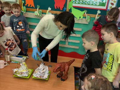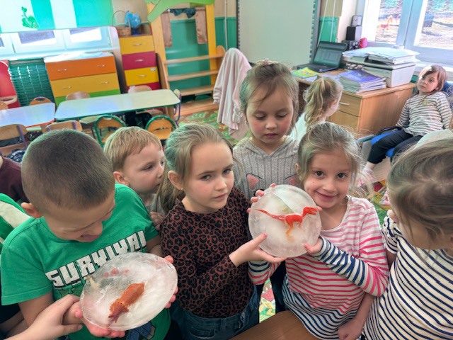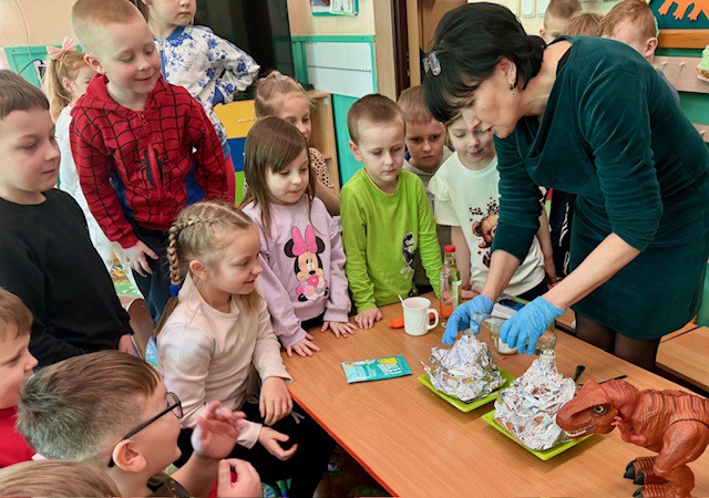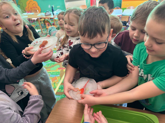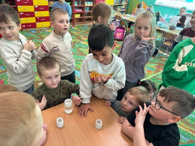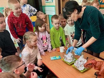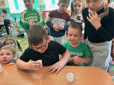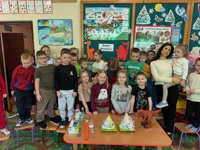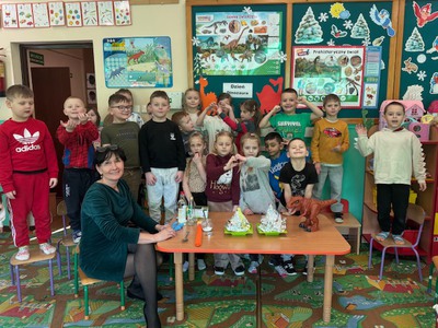 W oddziale przedszkolnym przeprowadzono serię prostych doświadczeń przyrodniczych, których celem było rozwijanie ciekawości poznawczej dzieci oraz zapoznanie ich z podstawowymi zjawiskami zachodzącymi w przyrodzie. Pierwszym doświadczeniem był „wybuch wulkanu”. Dzieci obserwowały reakcję zachodzącą po połączeniu sody oczyszczonej z octem. Po dodaniu barwnika powstała pieniąca się „lawa”, która wypływała z przygotowanego modelu wulkanu. Dzięki temu doświadczeniu dzieci mogły zobaczyć, jak wygląda erupcja wulkanu oraz dowiedzieć się, że podczas reakcji chemicznej może powstawać gaz powodujący pienienie się substancji. Drugim doświadczeniem było pozyskiwanie soli z osolonej wody. Do naczynia z wodą dodano sól i dokładnie ją wymieszano, aż do całkowitego rozpuszczenia. Następnie pozostawiono roztwór do odparowania. Po pewnym czasie dzieci mogły zaobserwować powstawanie kryształków soli. Dzięki temu dowiedziały się, że woda może wyparować, a rozpuszczona w niej sól pozostaje w naczyniu. Trzecim doświadczeniem była obserwacja zmiany stanu skupienia wody. Woda została wlana do miseczek i umieszczona w zamrażarce. Po pewnym czasie dzieci zobaczyły, że zamieniła się w lód, czyli przeszła ze stanu ciekłego w stały. Następnie lodowe góry pozostawiono w temperaturze pokojowej i obserwowano, jak topnieją, wracając do stanu ciekłego. Przeprowadzone doświadczenia wzbudziły duże zainteresowanie dzieci. Uczestnicy aktywnie obserwowali przebieg doświadczeń, zadawali pytania oraz dzielili się swoimi spostrzeżeniami. Zajęcia pomogły dzieciom w prosty i atrakcyjny sposób zrozumieć wybrane zjawiska przyrodnicze. |