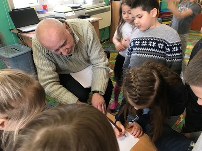 Dnia 22.02.2022r. starszą grupę przedszkolaków odwiedził dziennikarz pan Wojciech Chmura – człowiek wielu talentów. Pan Wojciech pracował w Dzienniku Polskim, Gazecie Krakowskiej, był również radiowcem, czytał dzieciom bajki na dobranoc. Nasze przedszkolaki miały również możliwość kontaktu z literaturą w wykonaniu naszego Gościa, który zrobił to w sposób atrakcyjny i profesjonalny. Wysłuchały wierszy J. Tuwima: Lokomotywa, Rzepka, Ptasie radio. Były zachwycone. Bardzo pouczającym przeżyciem był także kontakt z dawnymi narzędziami pisarskimi. Dzieci pisały swoje imiona piórem maczanym w atramencie, oglądały drewniany piórnik, oraz zeszyty pana Wojtka. Spotkanie z Panem Chmurą a prywatnie dziadziem naszej uczennicy Alicji było pouczającym i ciekawym przeżyciem dla dzieci i uczestniczącej w tym spotkaniu naszej Pani Dyrektor Elżbiety Samek. Maria Sambak |