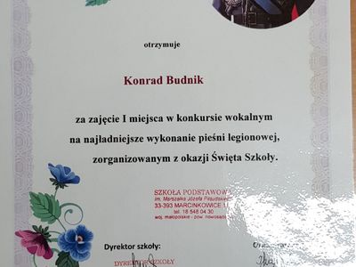 Konkurs pieśni legionowych Klasy 0-3 I miejsce – Maria Tkaczyk, Julia Budnik II miejsce – Bartosz Plata III miejsce - Aurelia Gawlik Wyróżnienie – Wiktoria Mróz, Zuzanna Mróz, Andrzej Świderski, Klaudia Hybel