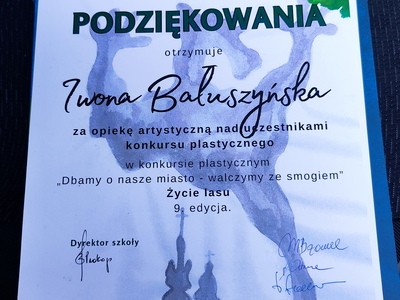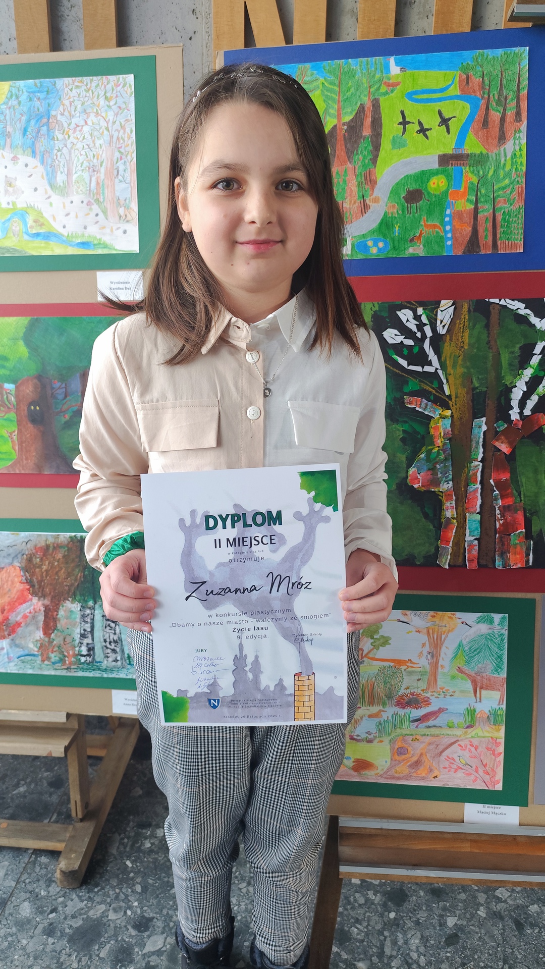 Z radością informujemy, że Zuzanna Mróz, uczennica klasy 4, zdobyła II miejsce w 9. edycji małopolskiego konkursu „Dbamy o nasze miasto – walczymy ze smogiem”, którego tegorocznym tematem było „Życie lasu”. Konkurs organizowany jest przez Prywatna Szkoła Podstawowa z Oddziałami Dwujęzycznymi nr 2 im. Noblistów Polskich w Krakowie. Inicjatywa cieszy się wsparciem wielu instytucji — m.in. patronat honorowy objęli prezydent miasta, fundusze ochrony środowiska, przedstawiciele lasów państwowych, a także lokalne instytucje kulturalne. Zuzia przygotowała piękną pracę plastyczną przedstawiającą bogactwo życia leśnego, wykazując się dużą wrażliwością artystyczną i zrozumieniem roli lasów w przyrodzie. Jej zaangażowanie i kreatywność zostały docenione przez jury konkursowe. Serdecznie gratulujemy Zuzi sukcesu oraz życzymy jej dalszych osiągnięć artystycznych! |