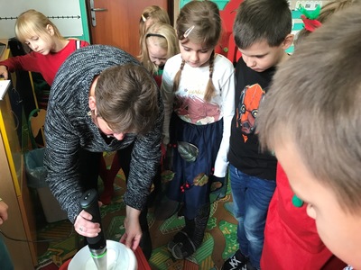 17.11.2021r. w ramach realizowanego projektu „ Zdrowie naszym skarbem ” którego celem jest poznawanie zasad dbałości o zdrowie. Przedszkolaki z Gr. 0 „A” zaprezentowały inscenizację „ Witaminkowe abecadło ” gościowi honorowemu Pani Dyrektor Elżbiecie Samek. Dzieci przebrane w piękne stroje przygotowane przez rodziców, prezentowały swoje umiejętności recytatorskie, taneczne i aktorskie. Na koniec degustowały koktajl owocowy przygotowany przez Panią Smoleń.