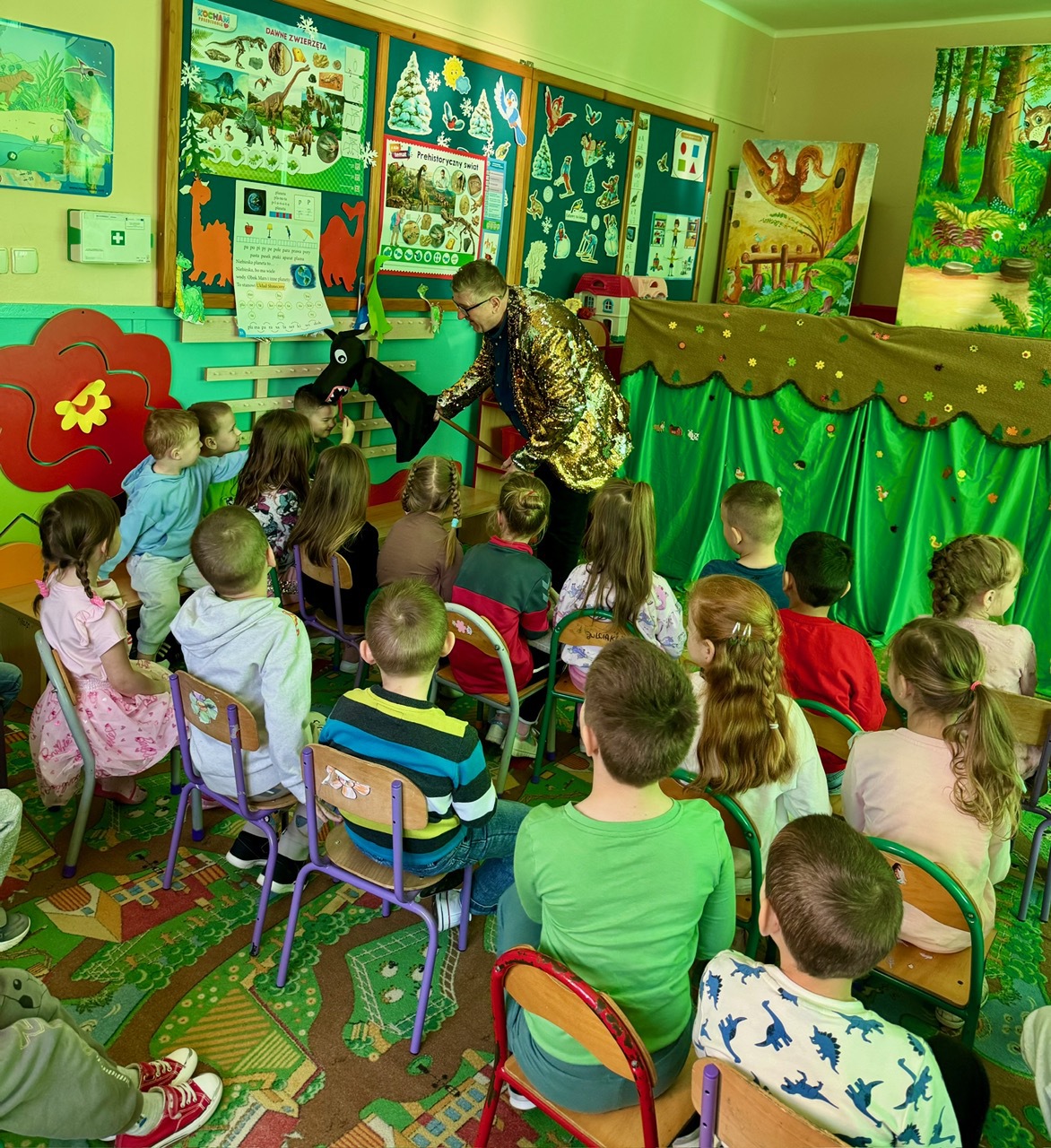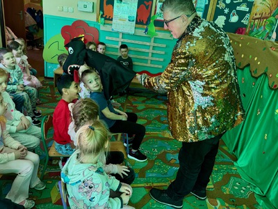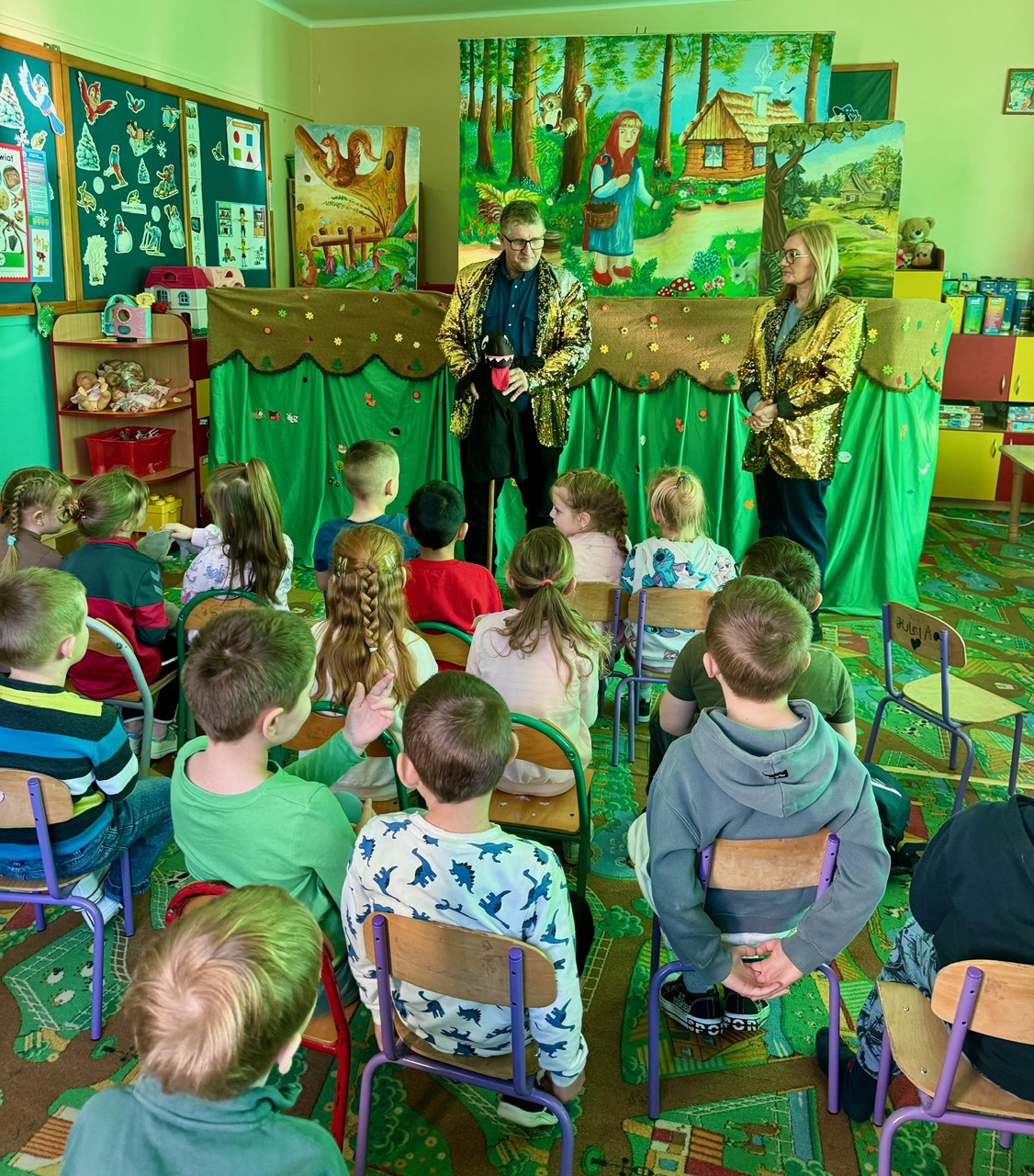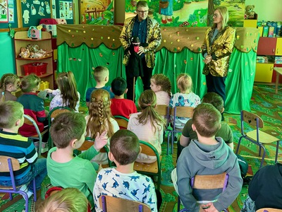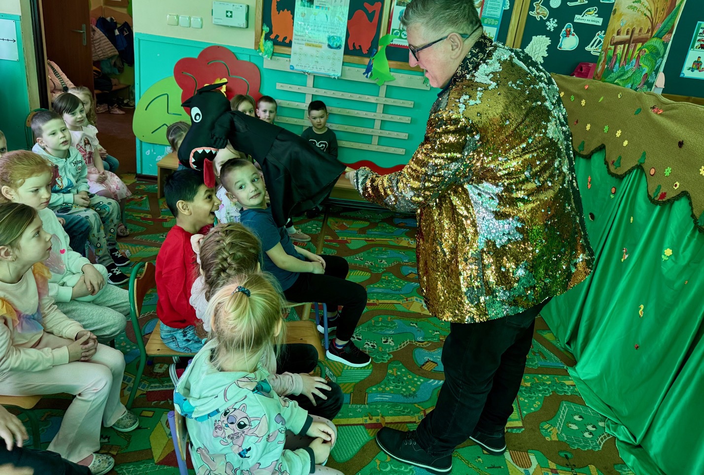 Spotkanie było dla dzieci nie tylko atrakcyjną formą rozrywki, ale również wartościową lekcją dotyczącą bezpiecznego zachowania. Przedszkolaki z dużym entuzjazmem przyjęły występ i chętnie brały udział w rozmowie po przedstawieniu. |