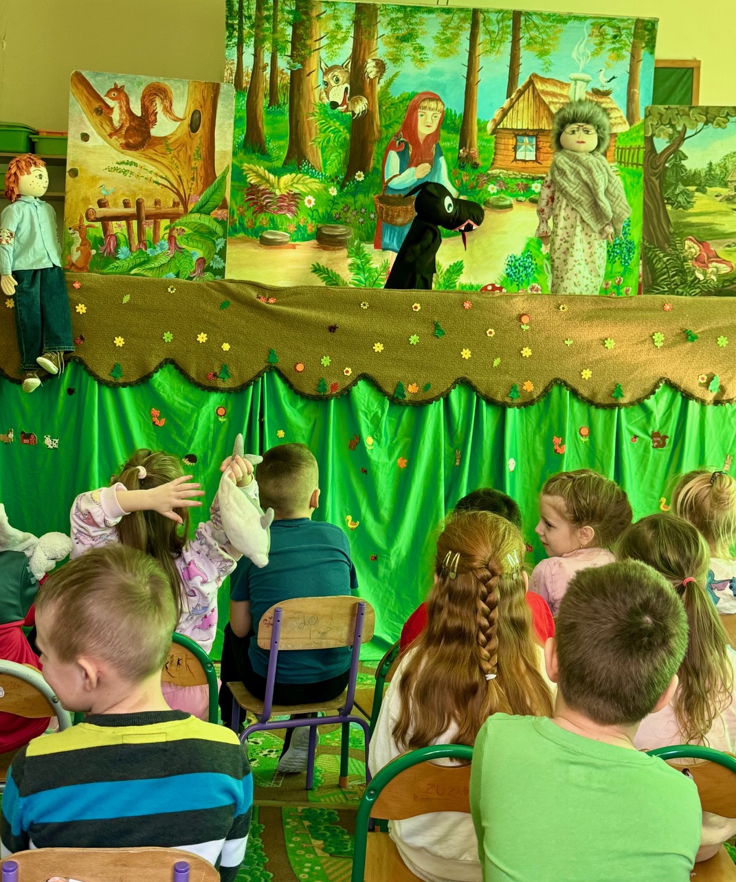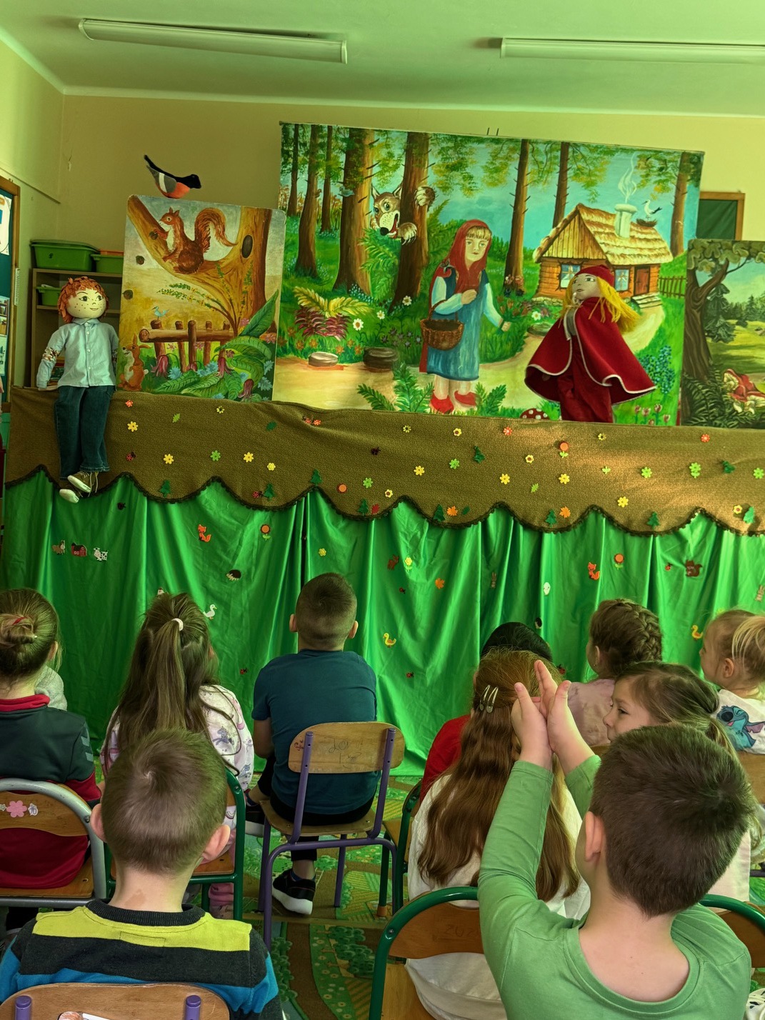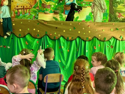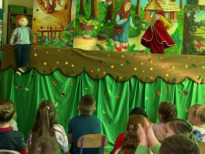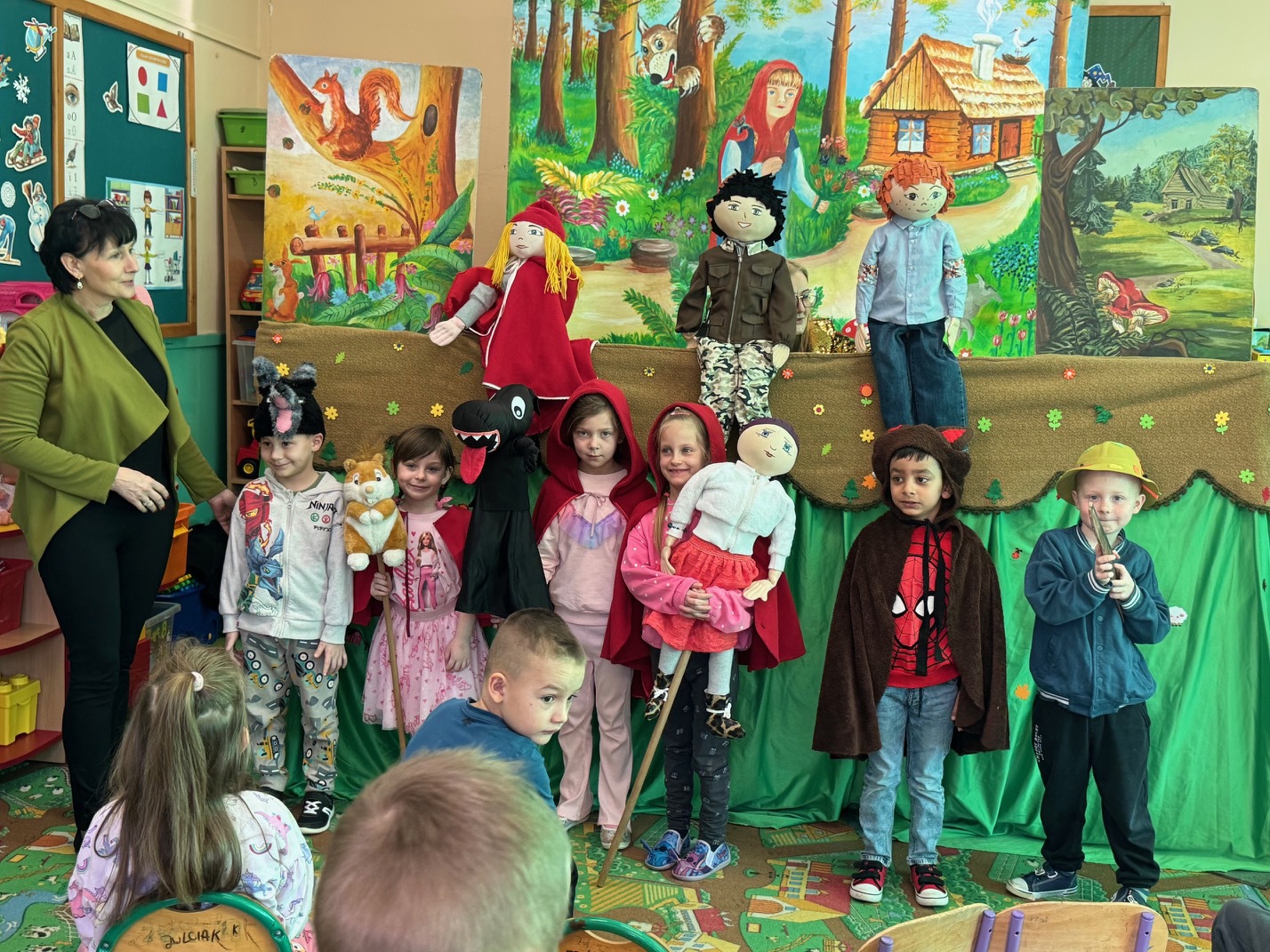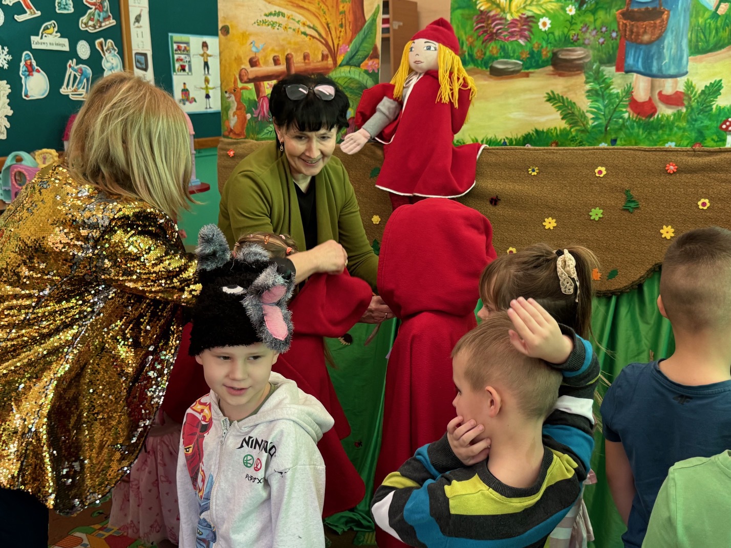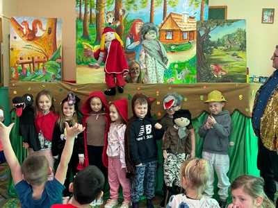 | Oddział przedszkolny odwiedził teatr lalek, który zaprezentował dzieciom przedstawienie pt. „Czerwony Kapturek”. Spektakl został przedstawiony w ciekawy i humorystyczny sposób, dzięki czemu dzieci z dużym zainteresowaniem śledziły losy bohaterów bajki.