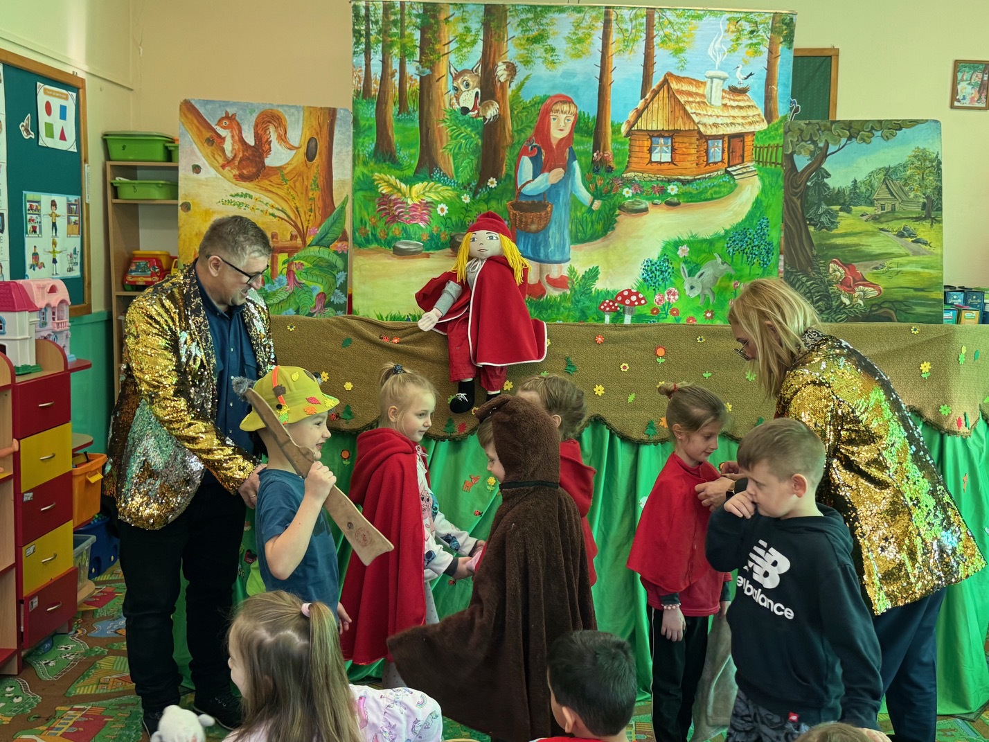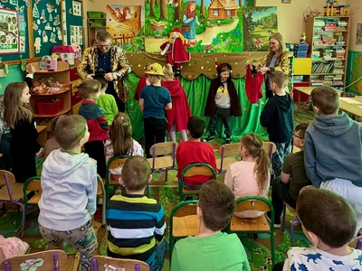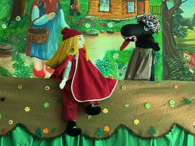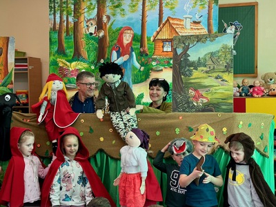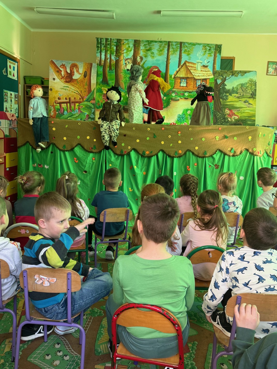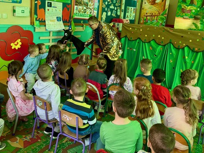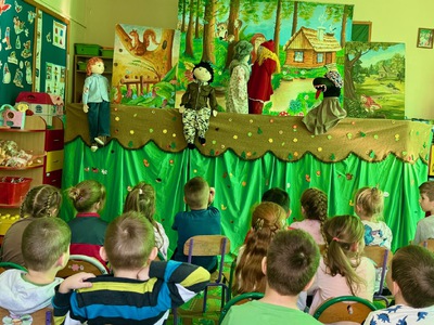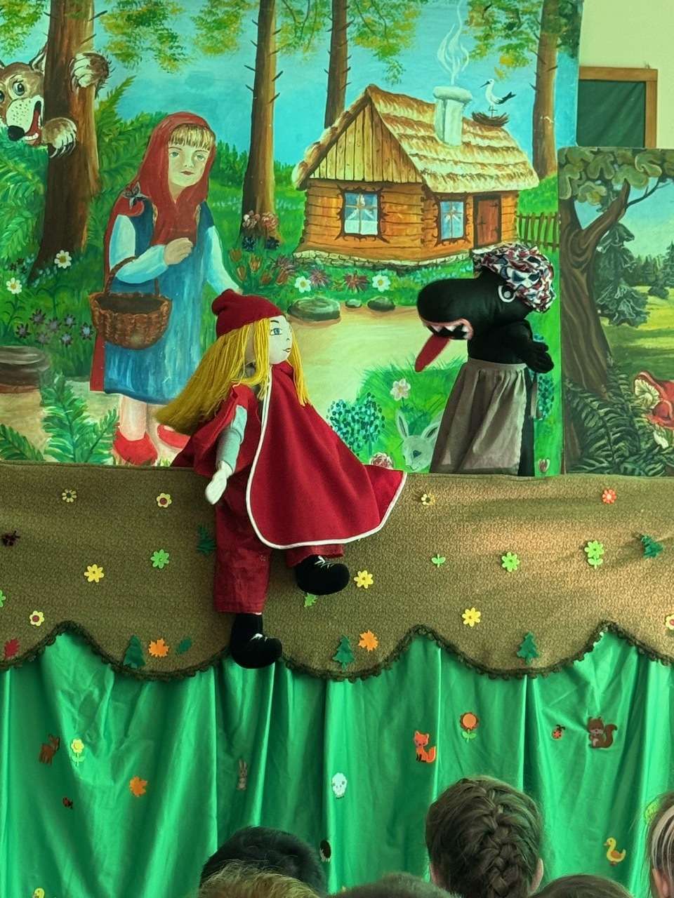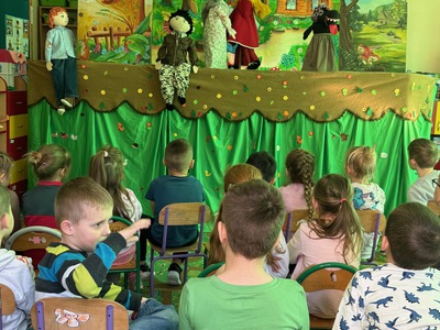 | Oddział przedszkolny odwiedził teatr lalek, który zaprezentował dzieciom przedstawienie pt. „Czerwony Kapturek”. Spektakl został przedstawiony w ciekawy i humorystyczny sposób, dzięki czemu dzieci z dużym zainteresowaniem śledziły losy bohaterów bajki.