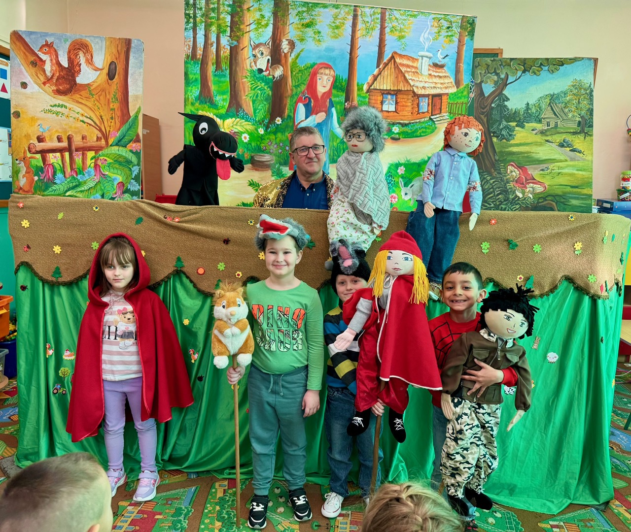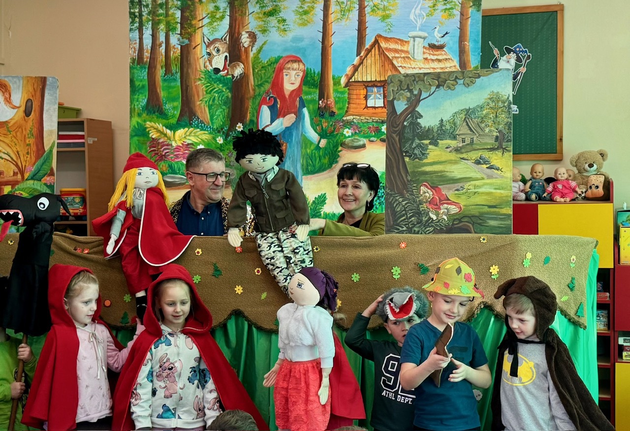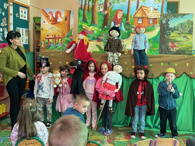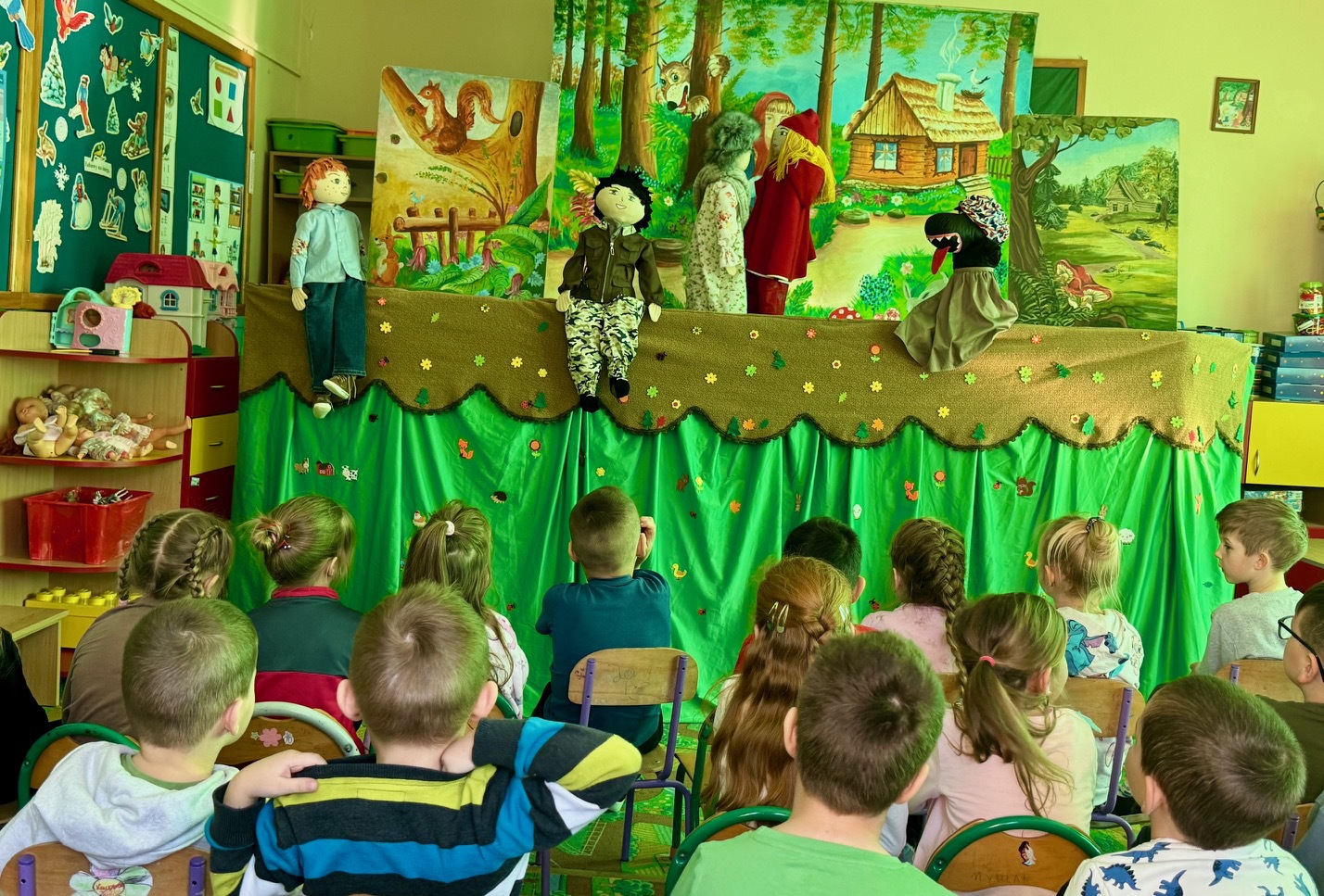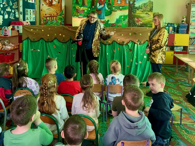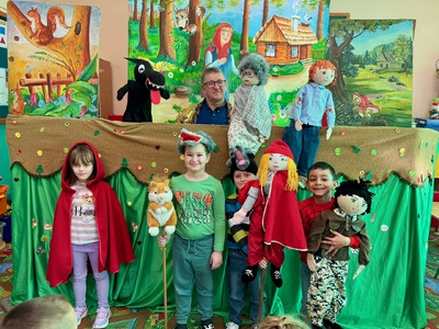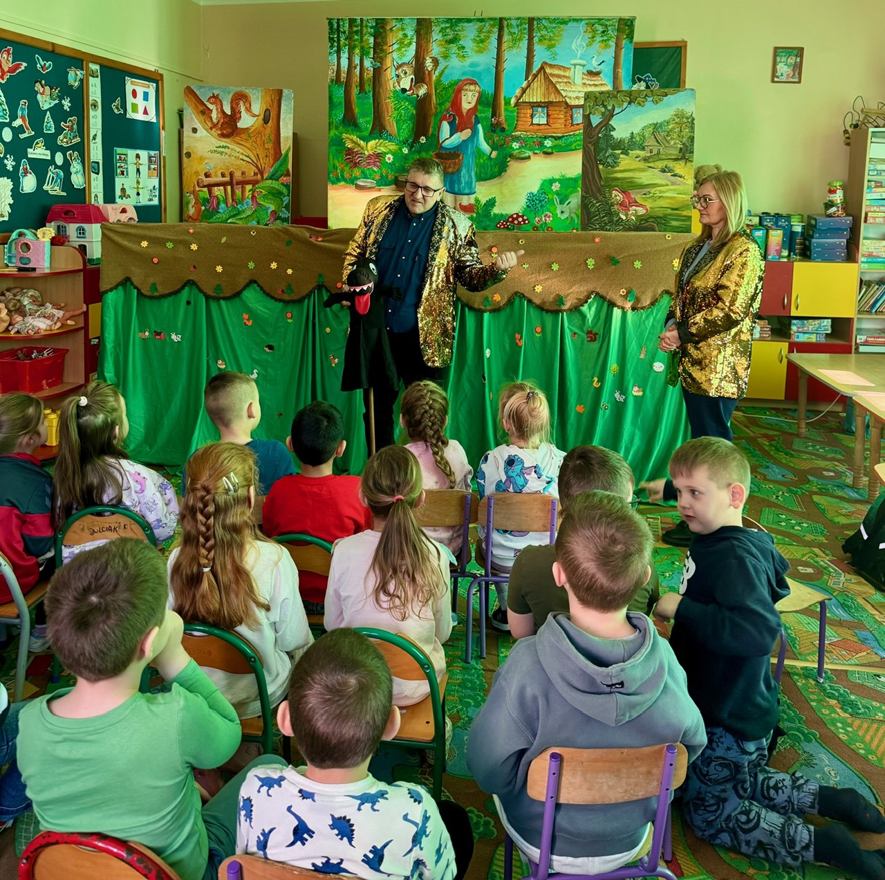 | Oddział przedszkolny odwiedził teatr lalek, który zaprezentował dzieciom przedstawienie pt. „Czerwony Kapturek”. Spektakl został przedstawiony w ciekawy i humorystyczny sposób, dzięki czemu dzieci z dużym zainteresowaniem śledziły losy bohaterów bajki.